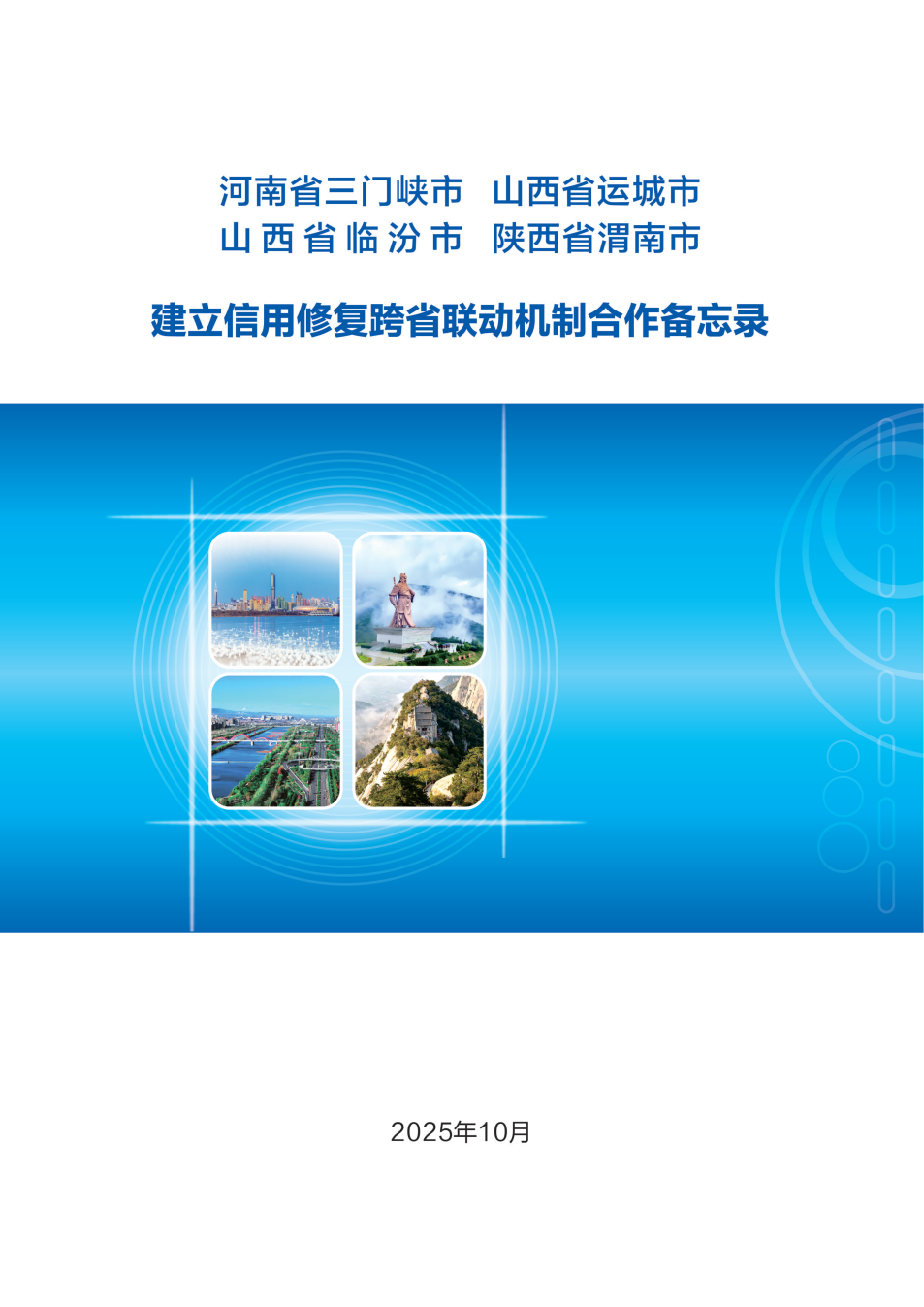 为深入贯彻党的二十大和二十届二中、三中全会精神,落实《中共中央办公厅 国务院办公厅关于加快建设全国统一大市场的意见》和《中共中央办公厅国务院办公厅关于健全社会信用体系的意见》,深化晋陕豫黄河金三角区域协同发展,四市共同签署《信用修复跨省联动机制合作备忘录》,以信用协同破解区域发展壁垒,为区域一体化注入信用动能。